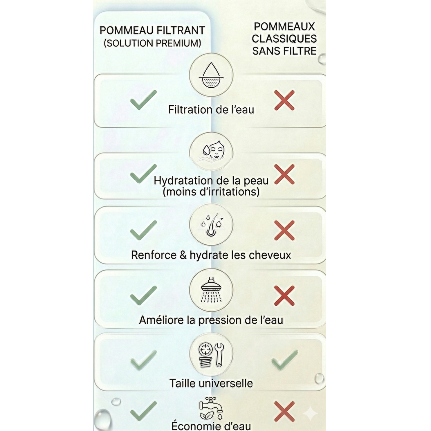Élimine chlore, calcaire et impuretés dès la première utilisation.
