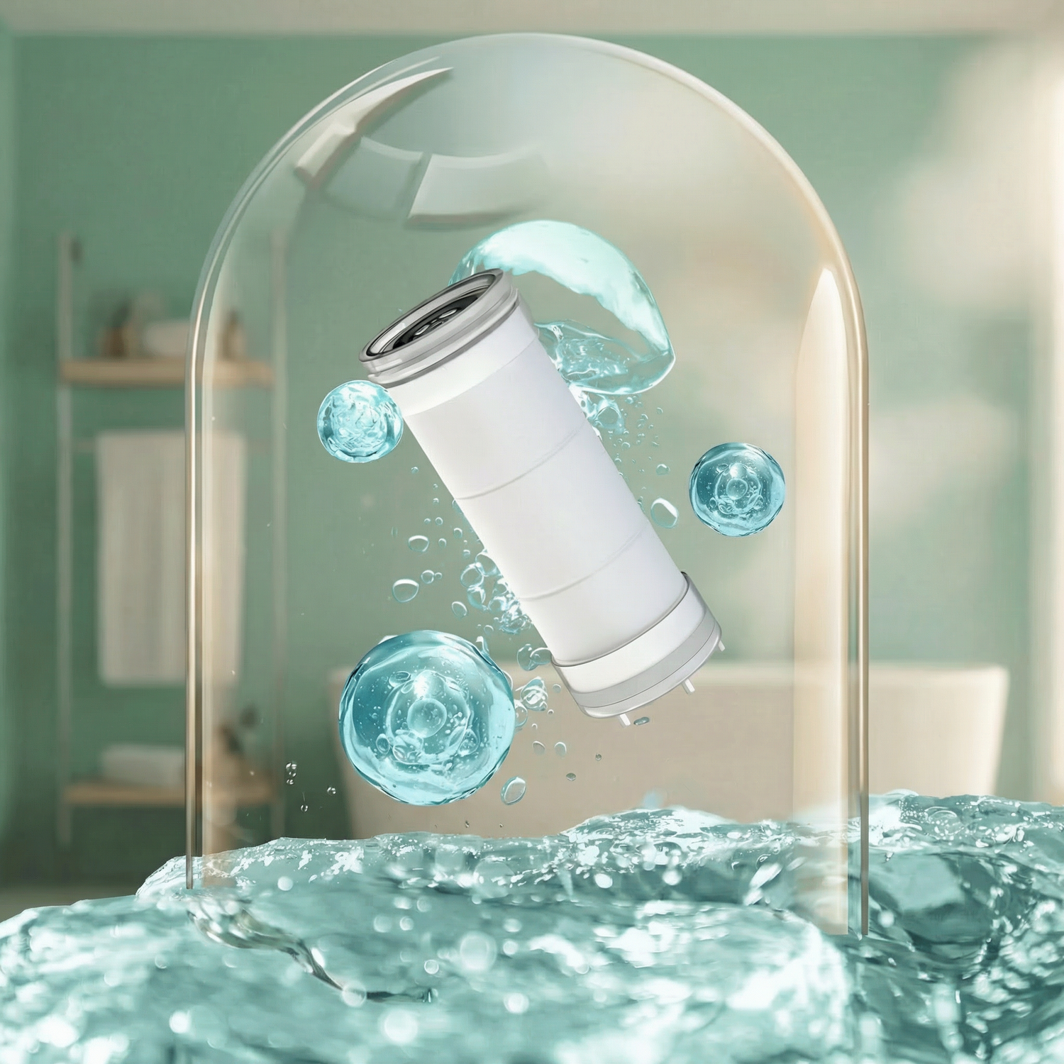 Le système de filtration aide à réduire le chlore, le calcaire et les impuretés présents dans l’eau, ce qui peut limiter la sécheresse cutanée et favoriser des cheveux plus doux et brillants.